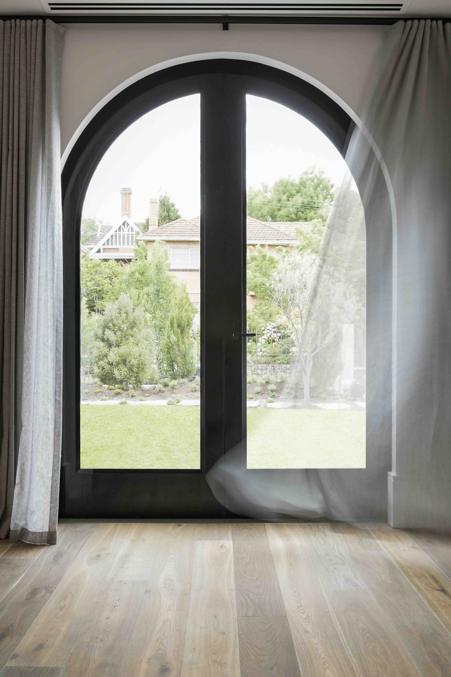 Custom arched doors connect living spaces to outdoor areas. Arched French doors maintain views while closing securely.